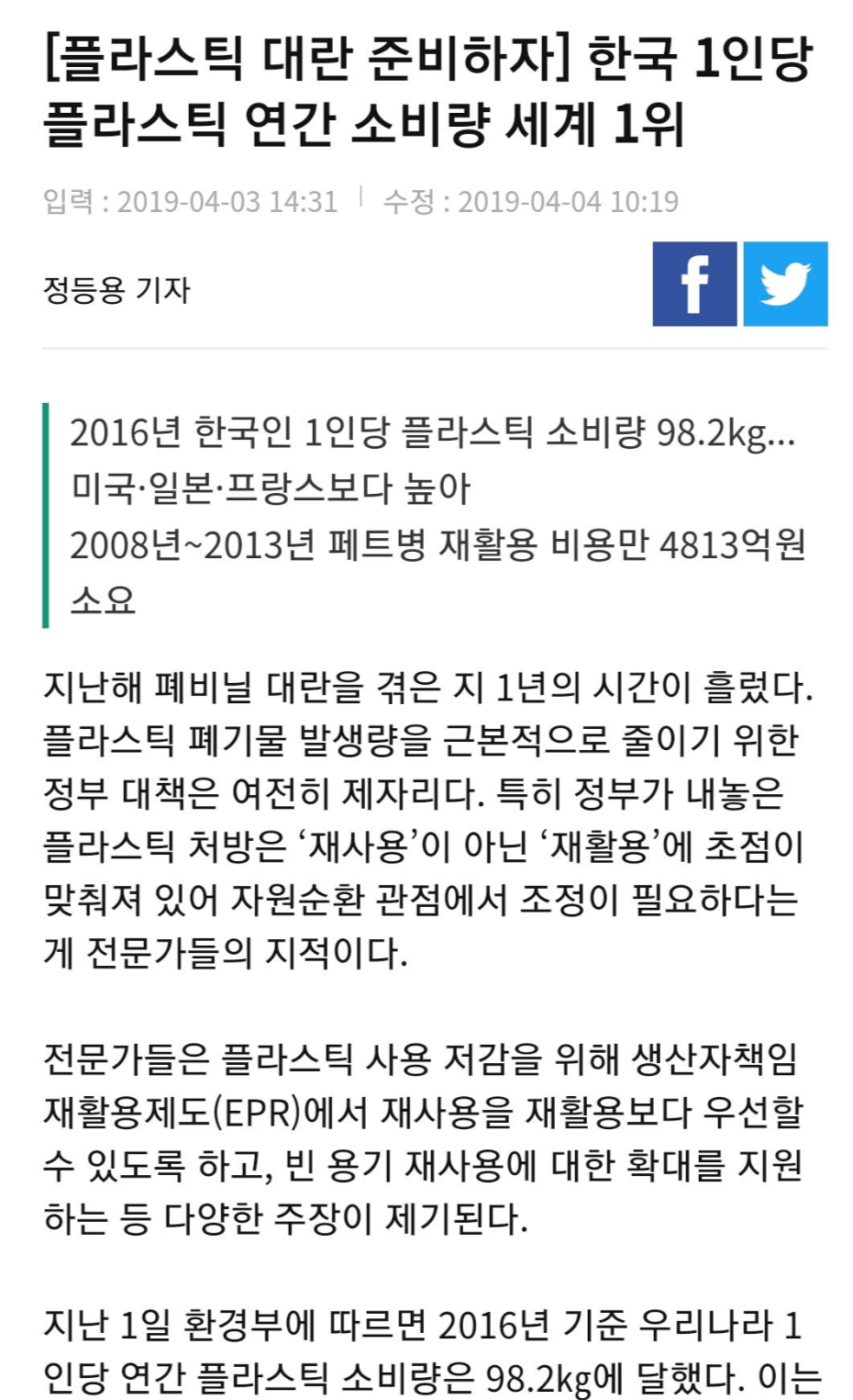 전세계가 수많은 플라스틱 쓰레기를 쏟아내는데 1인당 소비는 우리나라가 단연 1위라고 합니다.