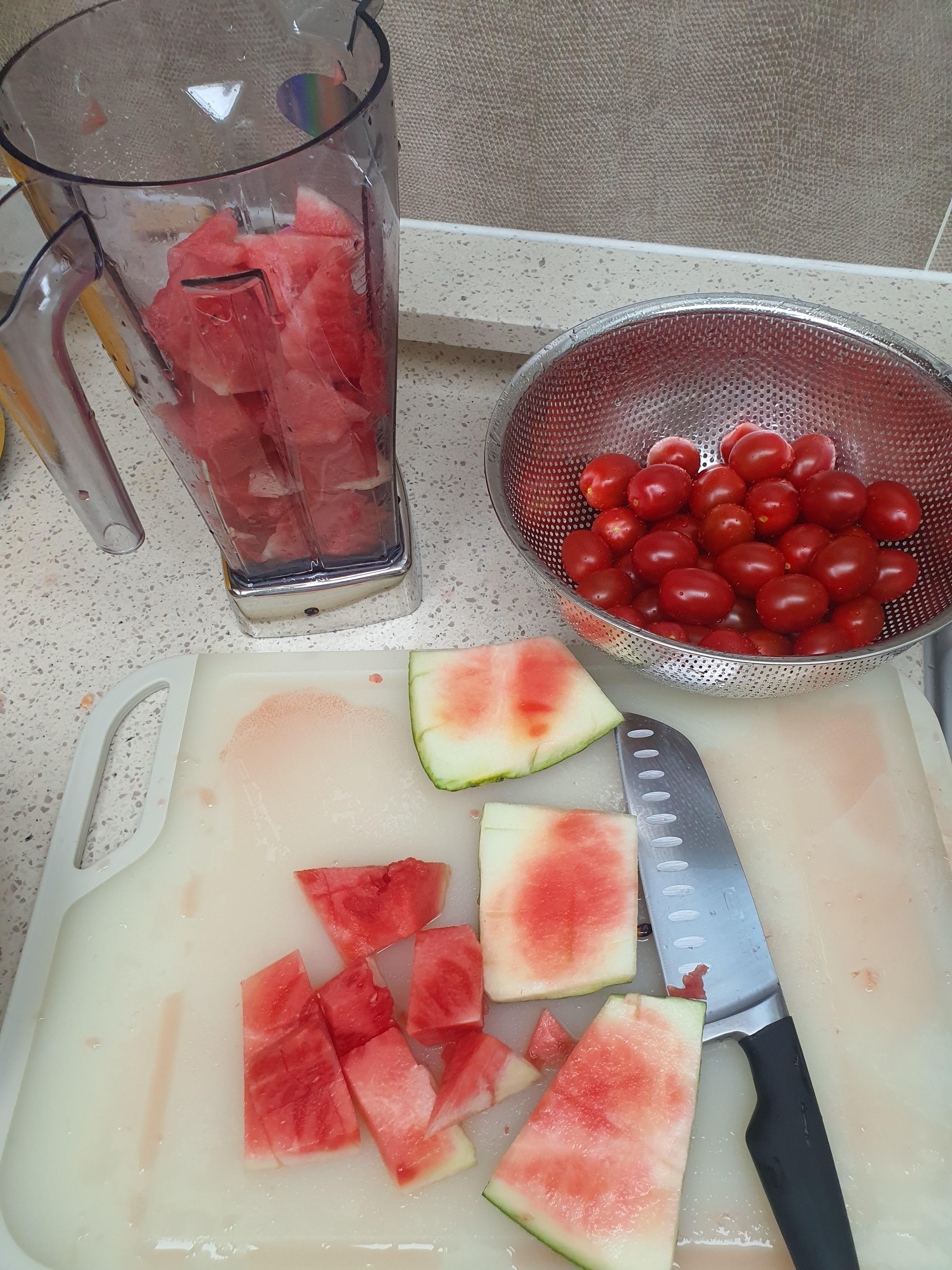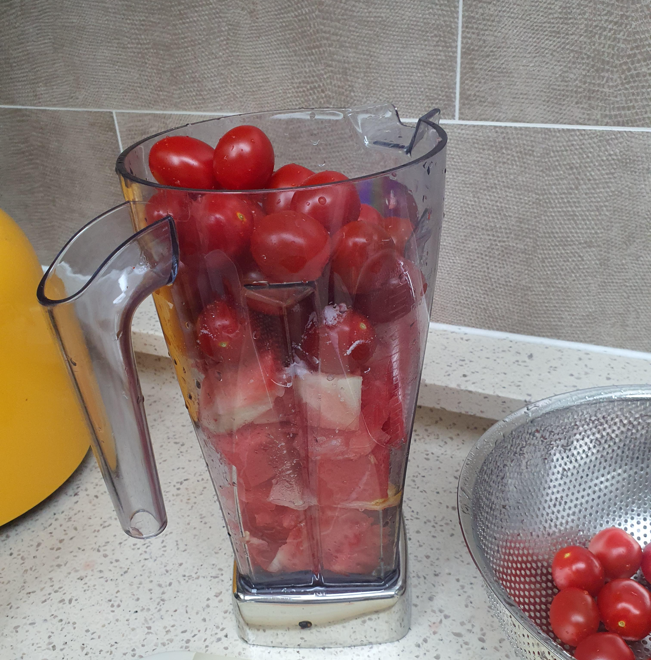 저는 한번 갈 때 수박 1/4통에서 나온 흰부분과 토마토를 잔뜩 넣고 갈아서 텀블러에 넣어둡니다.