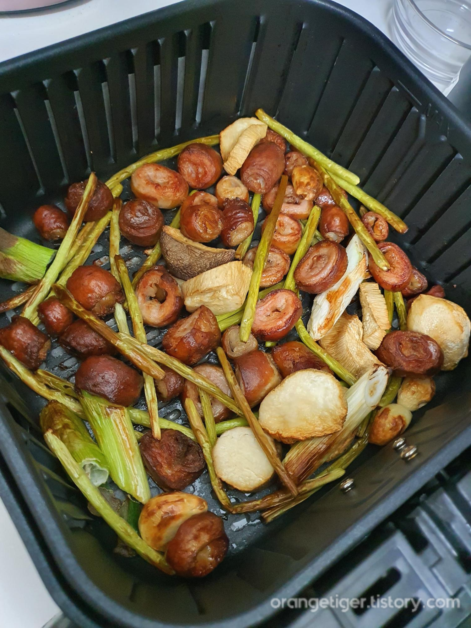 - 냉동상태에서 풀어진 막창을 대충 굴려주고 버섯, 마늘, 대파, 양파 등 모두 넣고 180도 12분 : 감자는 예외. 막창과 함께 넣어야 포슬포슬 익어요.