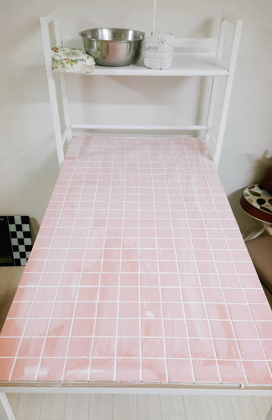 어차피 오래된 책상이니 레트로느낌으로 주황끼섞인 핑크타일을 선택했어요.