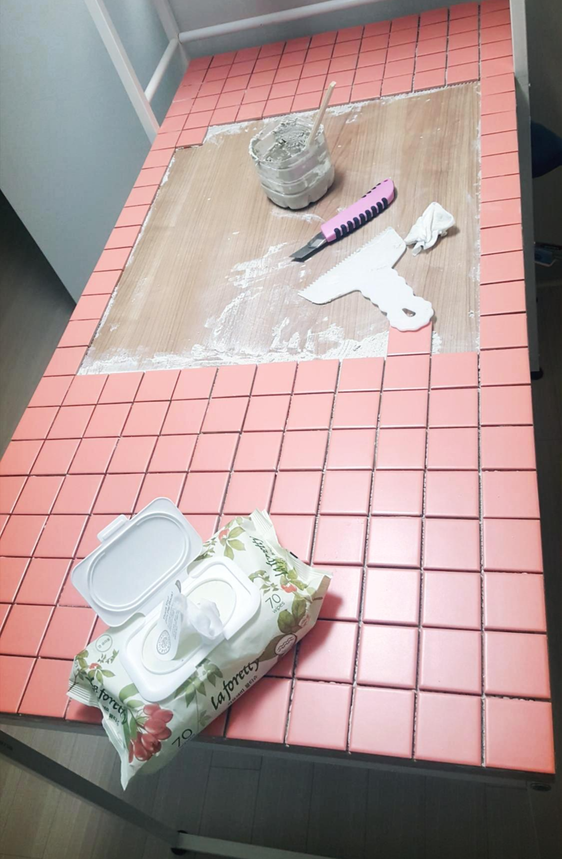 어차피 오래된 책상이니 레트로느낌으로 주황끼섞인 핑크타일을 선택했어요.