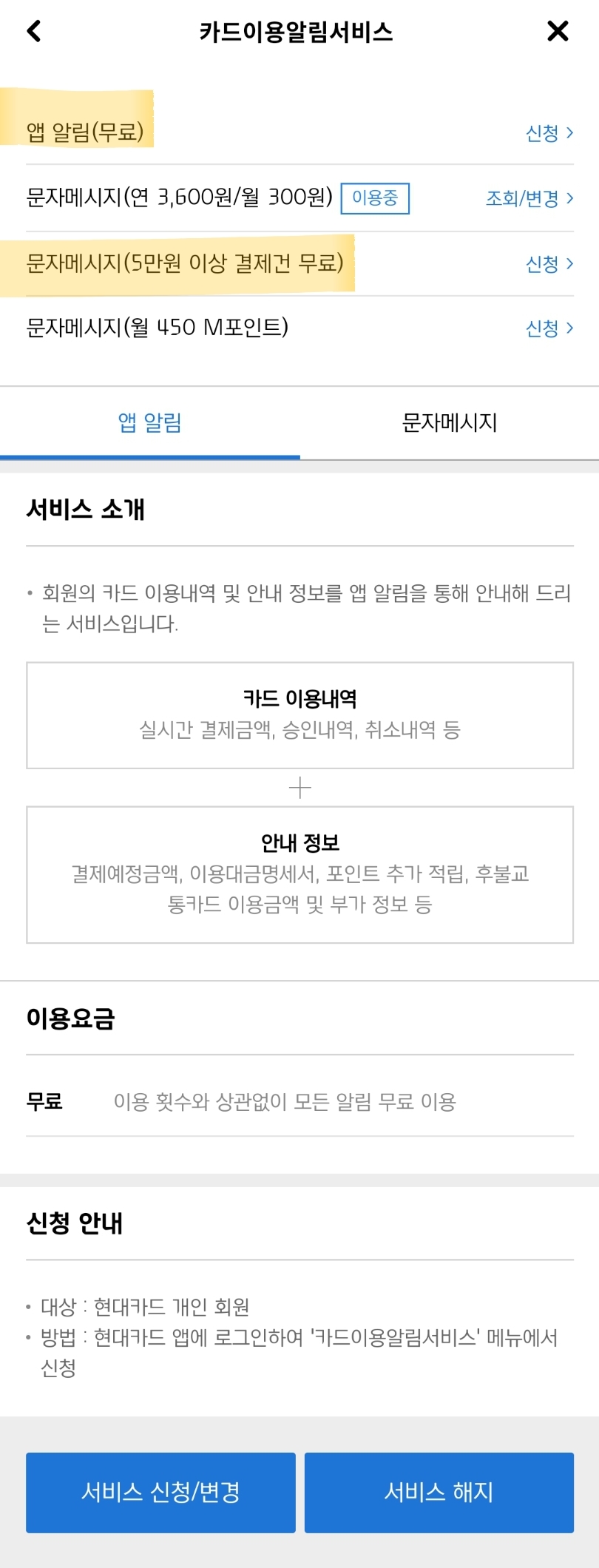 결제 문자(300원) or 결제시 앱 푸쉬(무료) 변경