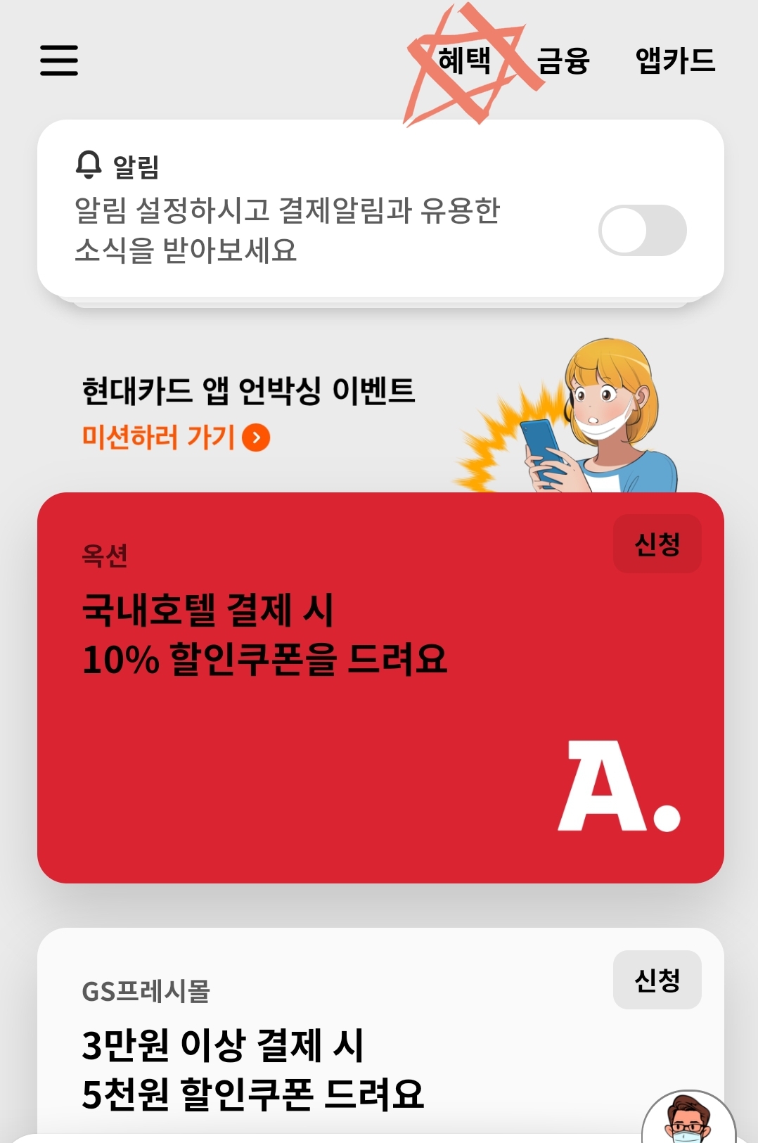 지난달 할인 신청하는 글을 쓴 이후, 현대카드 앱이 새로 바뀌었더라구요.