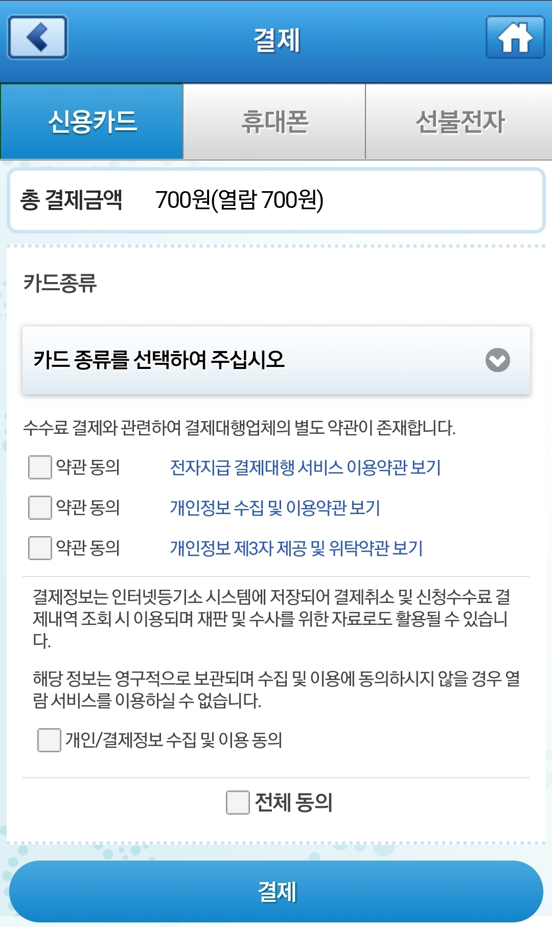 7. 열람대금 결제 (700원) : 신용카드 or 휴대폰결제 가능