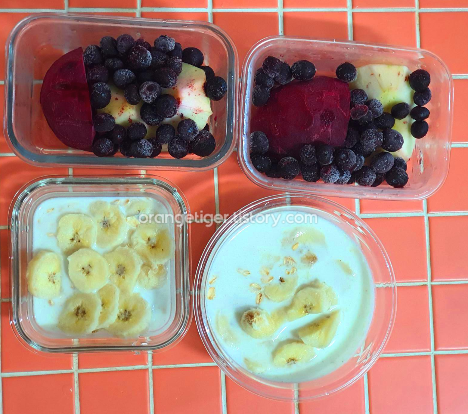 그냥 과일먹다 남은거 밀폐용기에 넣으면서 바나나도 까넣고, 견과류나 야채몇조각 함께 넣어서 내일 아침 믹서기에 넣고 물만 넣어서 갈면 되게끔 만들어보세요. 굳이 갈아먹지 않더라도 가지고나가서 차안에서 집어먹어도 좋아요.
