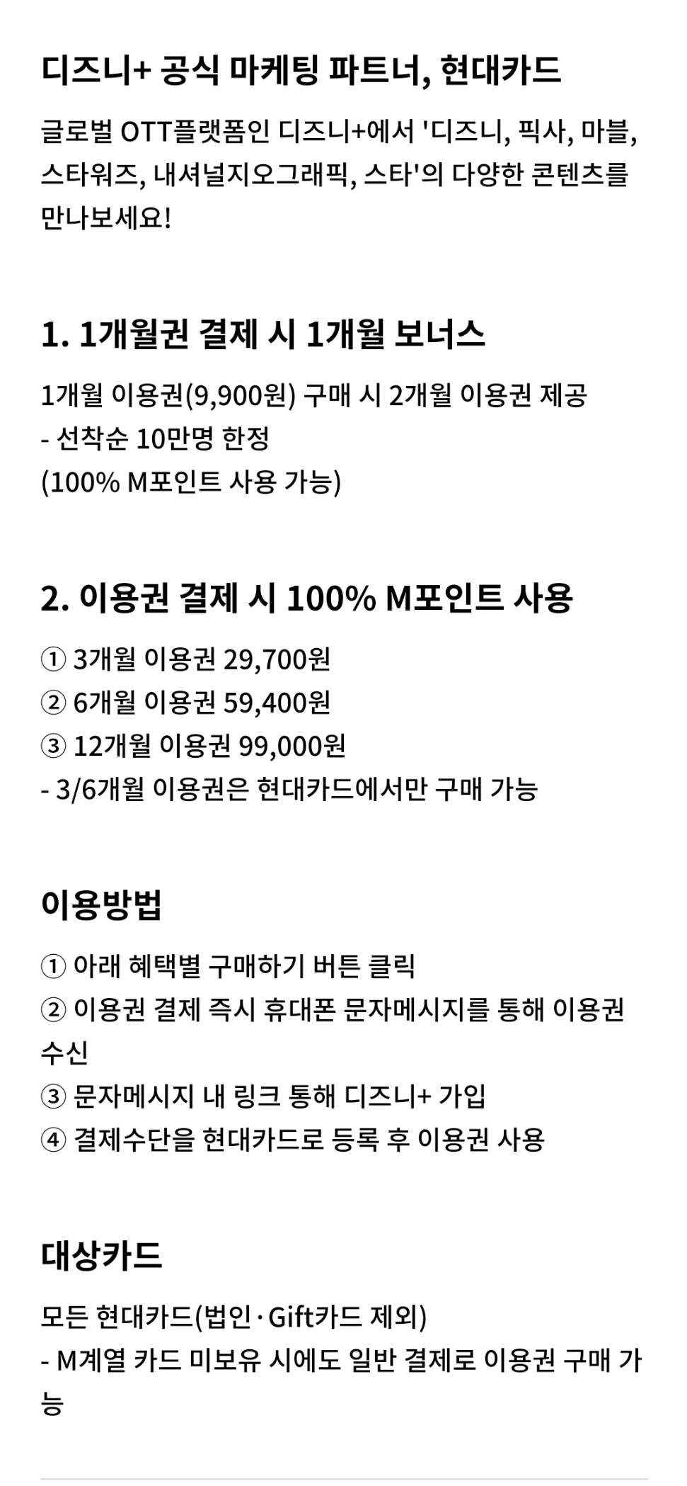 현대카드 앱에서 신청하면 쿠폰코드와 링크가 문자로 전송되는데 링크를 통해서 회원가입하면 자동으로 적용되어 두달치를 제공합니다.