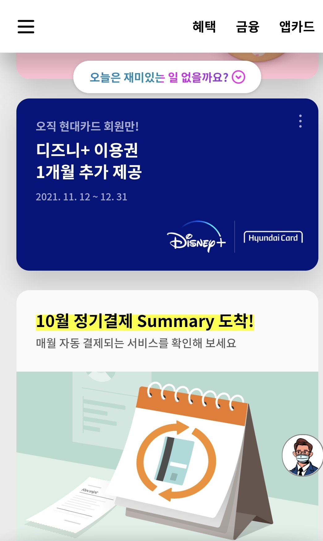 현대카드 앱에서 신청하면 쿠폰코드와 링크가 문자로 전송되는데 링크를 통해서 회원가입하면 자동으로 적용되어 두달치를 제공합니다.