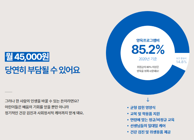 우선 컴패션은 뚜렷하게 제공되는 것들을 명시하고 활동금액의 배분을 드러내더라구요.