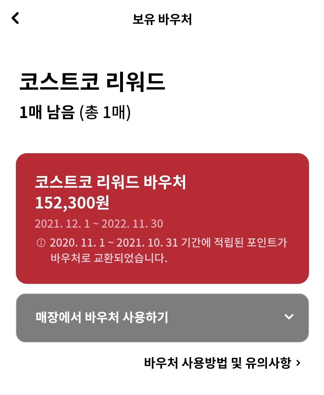 해마다 12월에 그동안 적립된 금액을 바우처로 발급되어 코스트코에서 바로 사용가능한 1:1 현금성 적립금