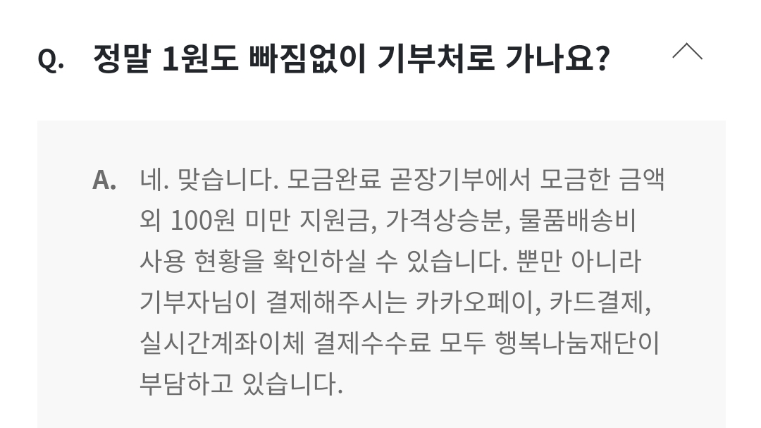 이게 가능한 이유가 곧장기부(행복나눔재단)자체가 SK그룹으로부터 지원받아 운영되고 있기때문에 운영비에 사용되는 금액이 전무하다고 합니다.