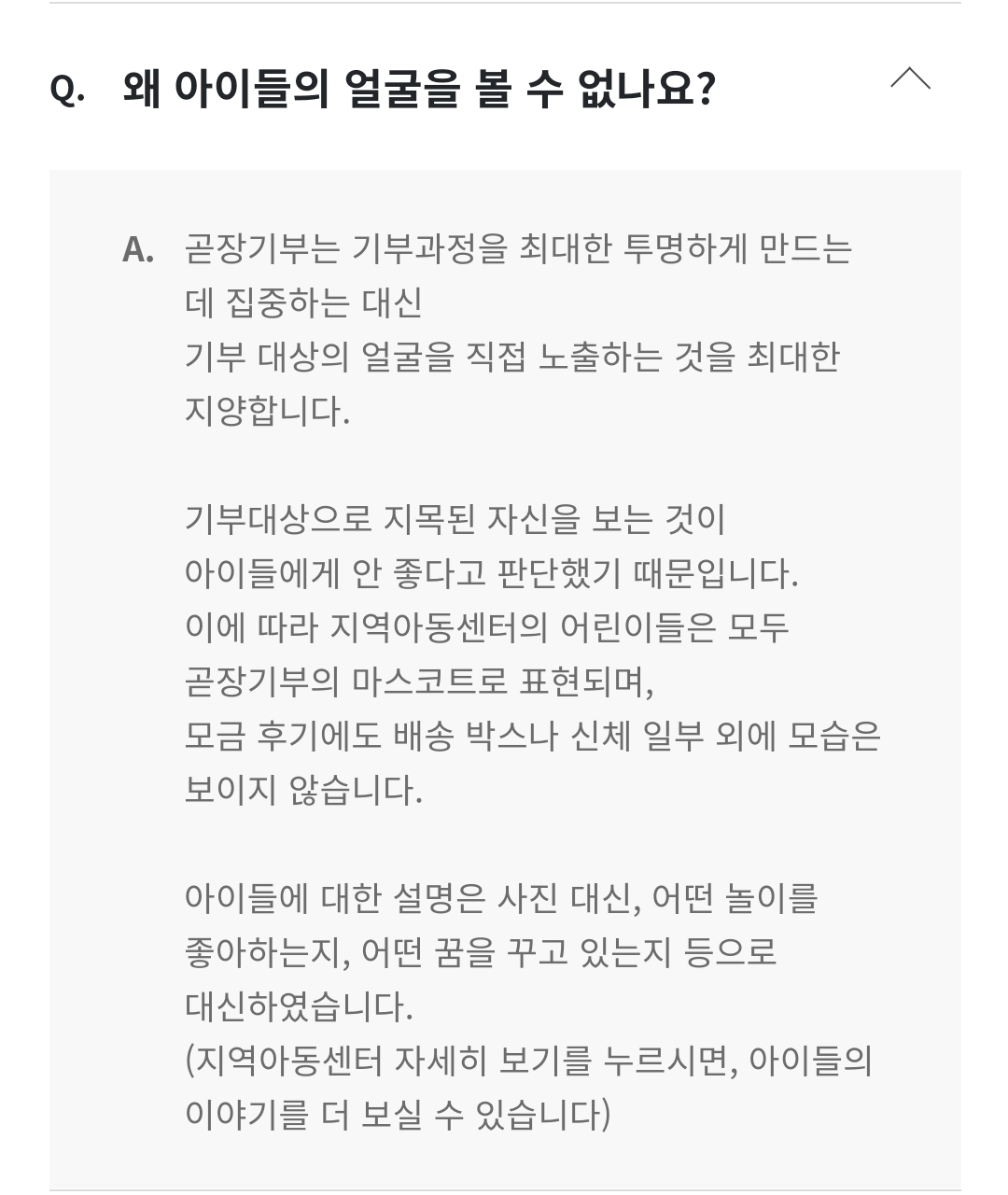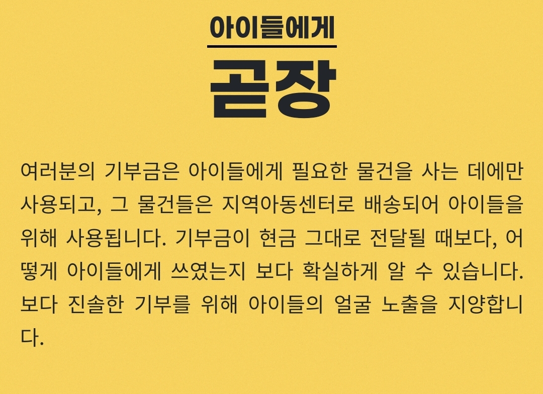 이건 모호한 경계에 있으니 뭐라고 단정짓기는 힘들지만 저는 아이들을 공개하지않는 곧장기부의 방침이 반가웠어요.