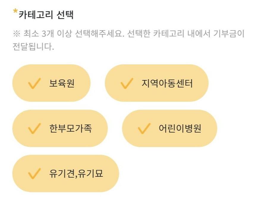 저는 보육원과 지역아동센터, 유기견&유기묘를 선택했어요. 특별히 원하는 대상자가 있는 분들에게 용이한 설정이라고 생각들더라구요. 고민을 많이 한 흔적이 보여 좋았습니다 :)