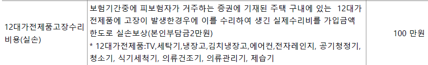 단지 화재보험으로 연간12만원이 사라지기보다 저처럼 12대가전 수리비용, 골절 등의 특약으로 곁가지 혜택을 보는것도 쏠쏠해서 가져와봤습니다.