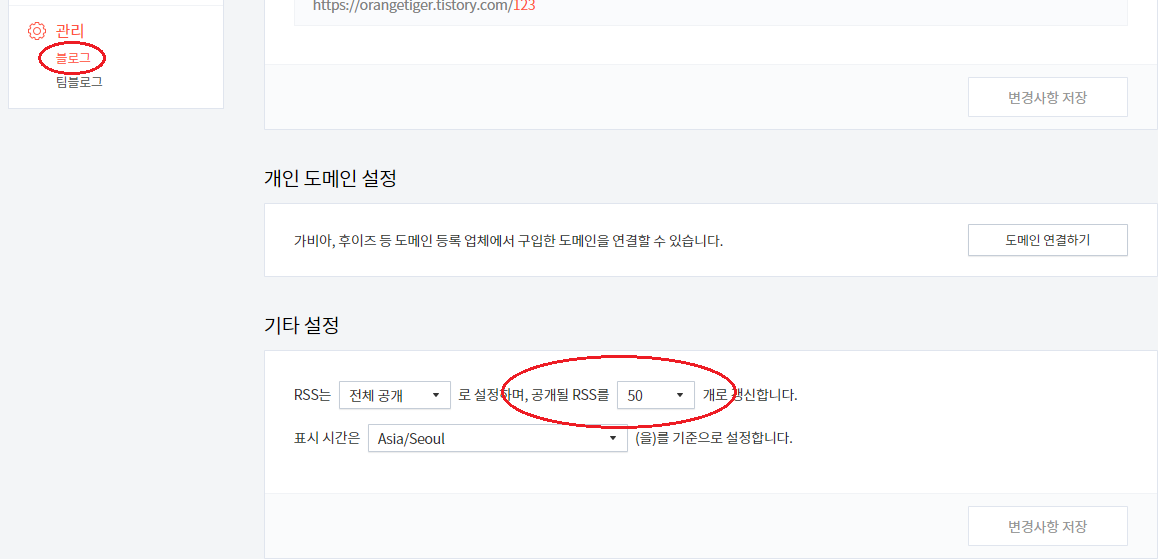 5. 블로그관리 >> 관리 >> 블로그 >> RSS 공개 50개로 변경