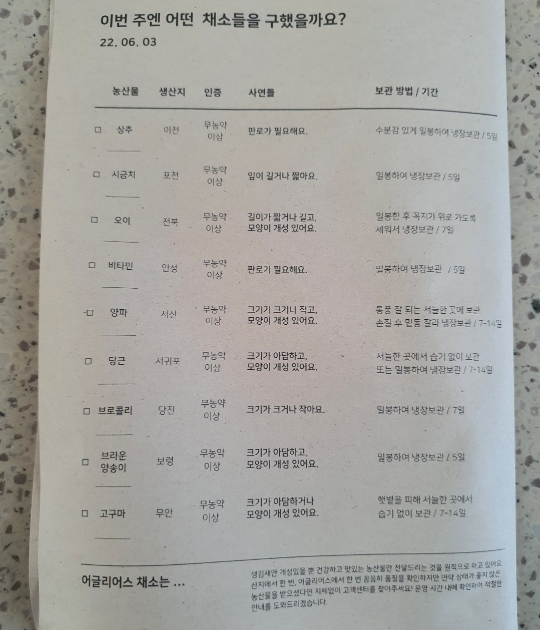하지만 1~2인 가구에게는 많은 양, 3~4인 가구지만 맞벌이라 장보러가기 바쁜 분들이라면 여러 좋은 의미에도 동참할 수 있어 꽤 괜찮은 방법이 아닌가 싶습니다.